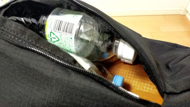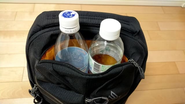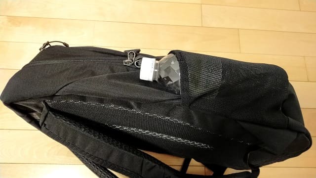 サイドの片方にはジッパー付きのサブ収納、もう片方にはボトルホルダーがあります。